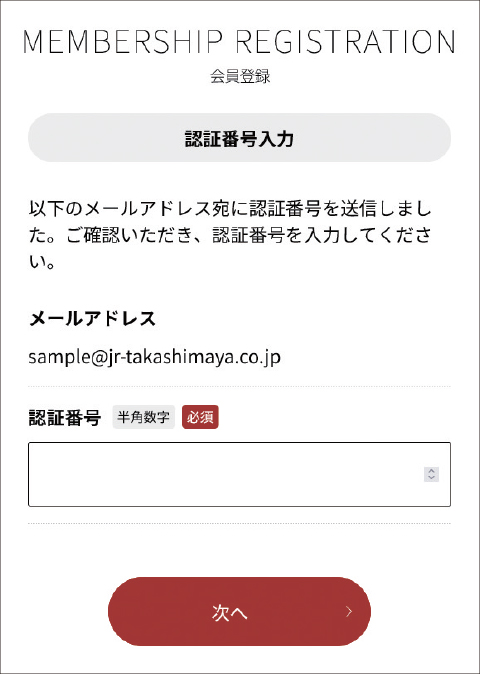 jrnt-info@jr-takashimaya.co.jp通过回信邮件发送认证号码。※根据您的终端的安全设定,认证号码可能无法送达,请在确认域名的指定接收设定后办理手续。