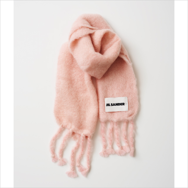印有印花标志的针织毛发长围巾。下摆的灵感细节令人印象深刻,标志标签被缝制。