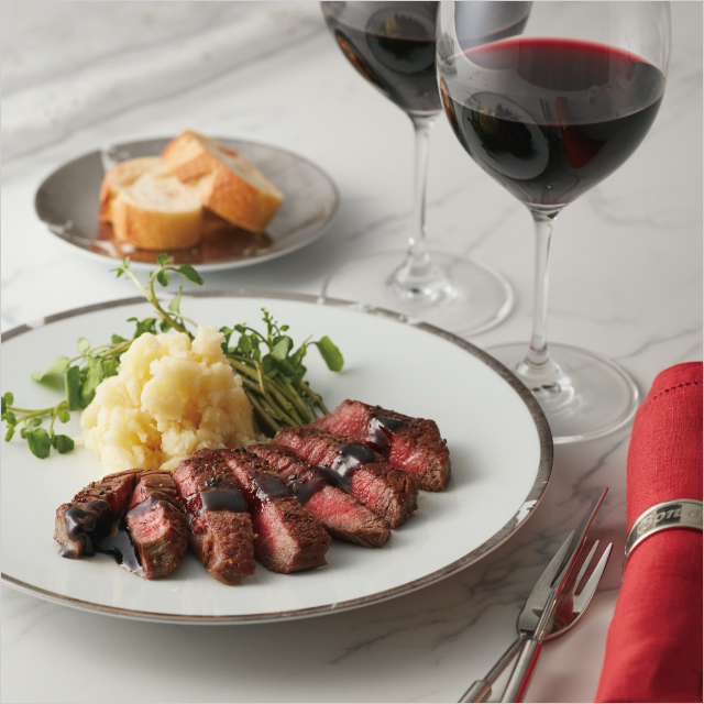 “这个红葡萄酒既华丽又优雅。果实味道也很好,单宁也很光滑。不太涩,醇厚甘甜,能感受到华丽香味的平衡感很好,所以和使用了巴萨米醋的清爽调味汁非常吻合。因为是王道的组合,所以可以奢侈地演出派对哦”