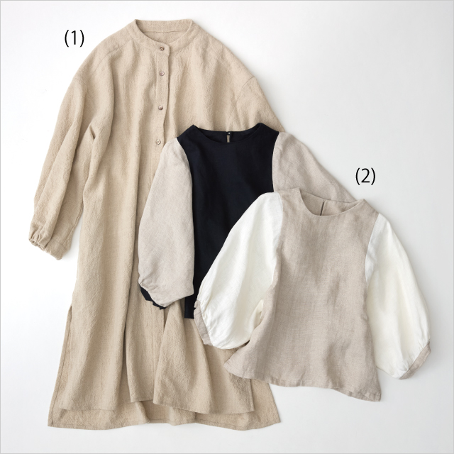 能让人感受到北欧风格温暖的自然设计的亚麻服。亚麻羊毛连衣裙很暖和,可以代替外套。可以安排到围巾。卷袖很可爱,麻100%的衬衫使用了两种颜色很新鲜。都是日本首次登场的道具。