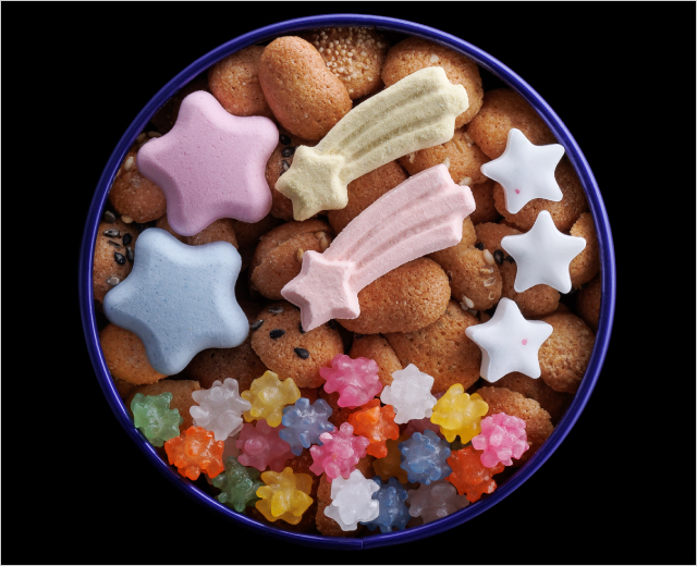 把江户点心师傅画的冬天夜空中闪耀的流星放入了特别的箱子里。脆脆的口感,让人联想到自然气息的温柔的色调和香气,是谁都能享受的一道菜。