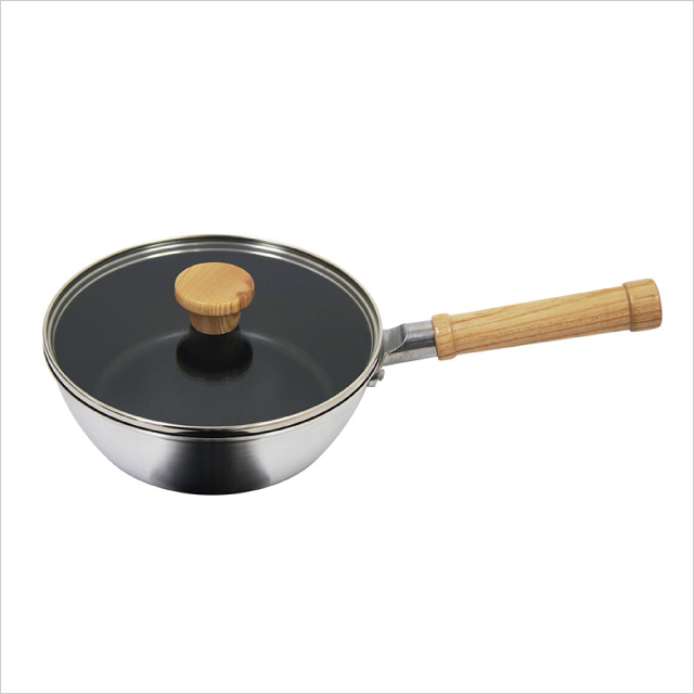 虽然有深度,但是底面很大,所以不仅可以炒菜,还可以煮菜、油炸菜、电饭等。经过磨砂加工的主体加上天然树的手柄,平坦的玻璃盖上木制下酒菜,简单时尚的设计也很受欢迎。