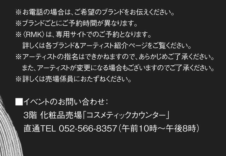 また、イベントなどの詳しい時間は、各会場またはインフォメーションでお問い合わせください。