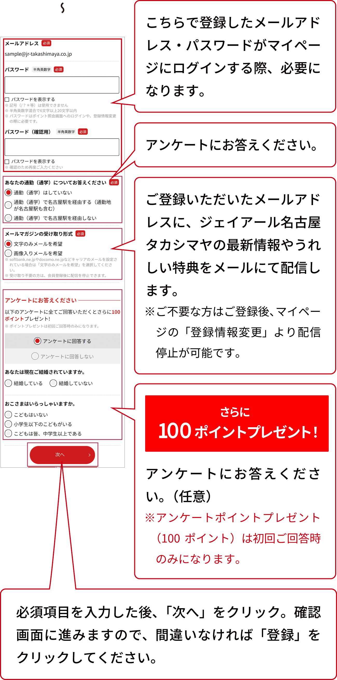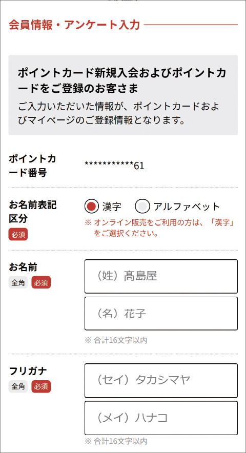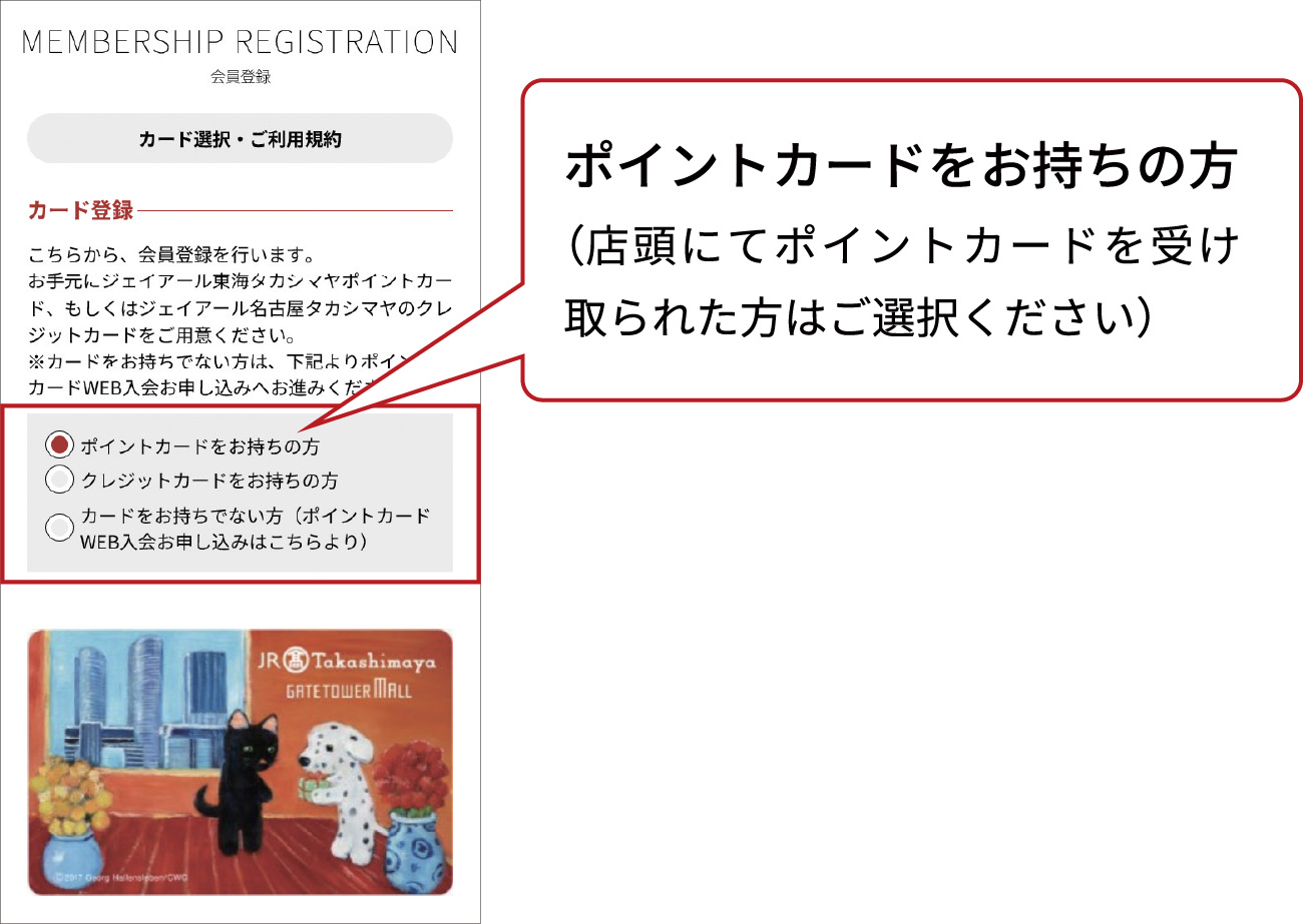 If you select the registered card and agree to the "Central Japan Railway Takashimaya Point Card" membership terms and conditions and the "JR Nagoya Takashima Yamai Page" membership terms, if you have a point card, please enter your 13-digit card number and date of birth. If you do not have a card, please enter your date of birth.