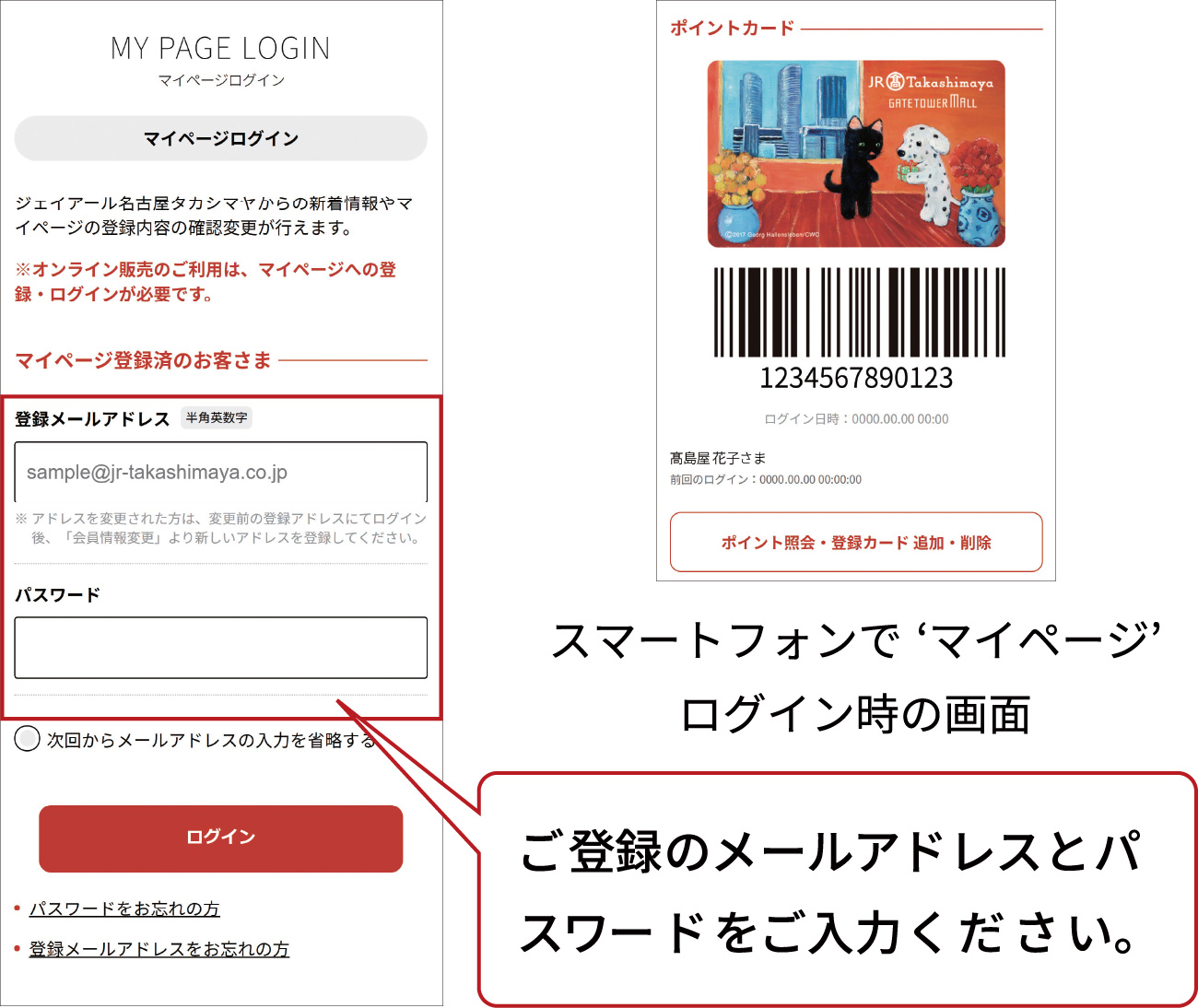 After registering, log in from the login page on JR Nagoya Takashimaya homepage or JR Nagoya Takashimaya app, you can check the total number of points on your card.※Depending on your model, you may not be able to register properly, or may not function properly, or you may not be able to browse.