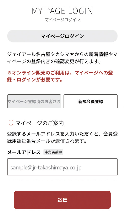 You will receive an authentication number by reply e-mail from jrnt-info@jr-takashimaya.co.jp.※The authentication number may not be delivered due to the security settings of your terminal, so please check the specified reception settings of your domain before proceeding.