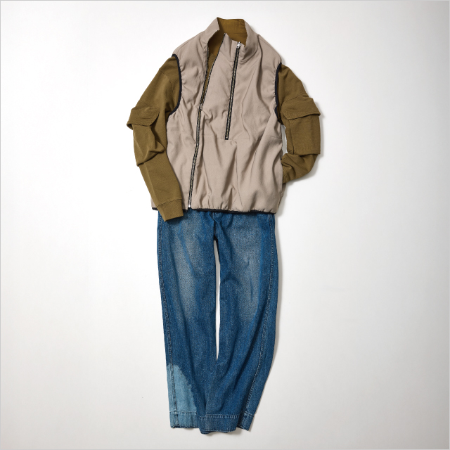 Layered with a soft cotton fleece sweat and a reversible vest. Serbidge denim pants become familiar with your skin as you wear them.