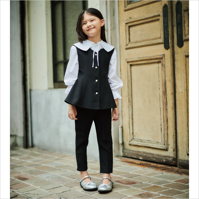 Peplum Silhouette vest made of sturdy double cross fabric and tapered Silhouette pants with a tuck in the center, look mature.