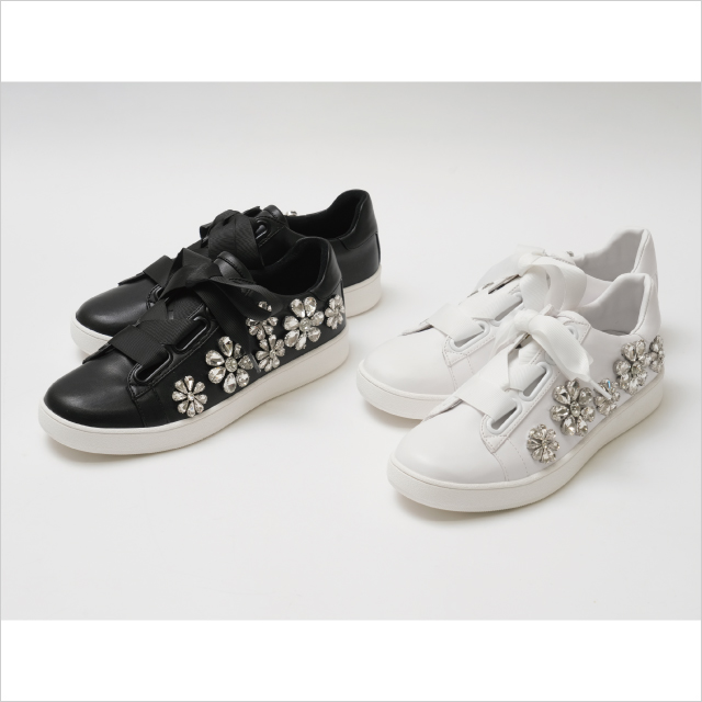 Ribbon sneakers with a gorgeous flower motif of large bijou. This pair adds overwhelming gorgeousness to your feet.