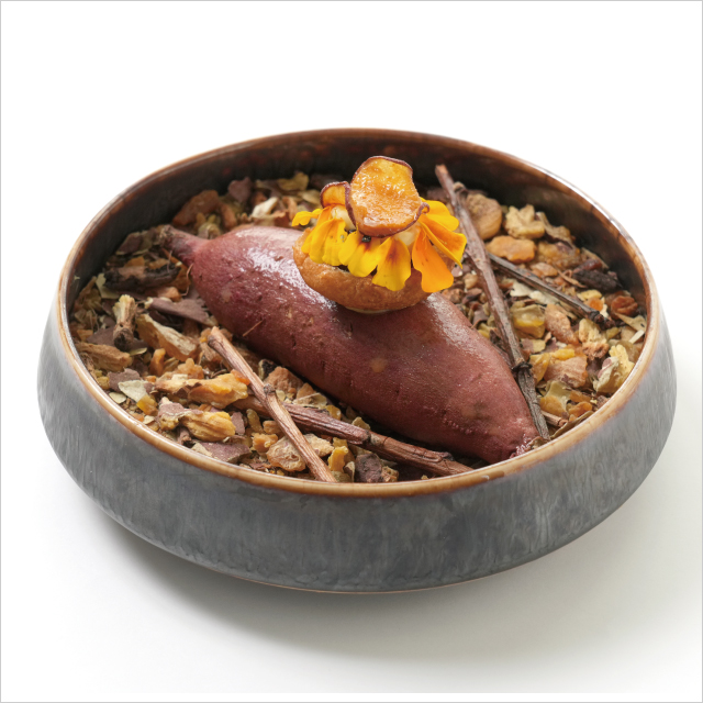 Paste made with sweet potato mixed with mascarpone and vanilla-flavored fresh cream. The savory baked tart is covered with lemon Zest in almond cream, adding a refreshing aroma. Caramel sauce is used as an accent.