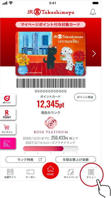 - ※「마이 페이지 등록된 신용카드」를 가지고 계신 고객님이 앱에서 「회원 정보 미등록 포인트카드」를 발행한 경우는, 앱의 로그인 화면에서 등록의 메일 주소와 패스워드로 로그인하여 미등록 포인트카드 정보가 자동으로 마이페이지에 추가됩니다.