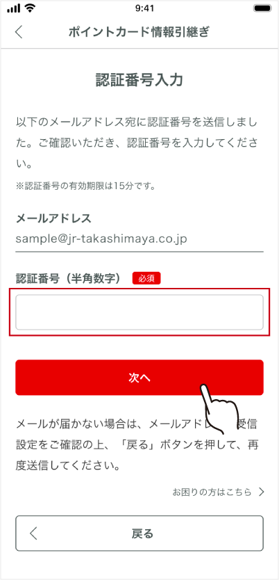 입력해 주세요. ※인증 번호의 유효기간은 메일 수신 후 15분간입니다. 15분 이후에 등록되는 경우는, 처음부터 다시 해 주세요.
