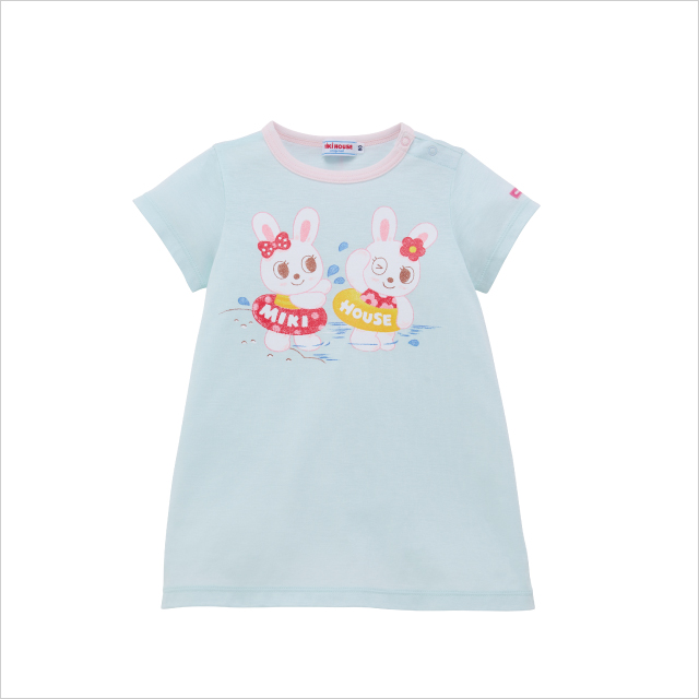 마스코트 캐릭터의 우사코짱의 일러스트가 귀여운 티셔츠 드레스 접촉 냉감 소재에 의한 섬뜩한 피부당, 옅은 블루가 시원함을 연출합니다. 조금 큰 Silhouette에서 바람을 통해 작은 오코님에게도 착탈하기 쉬운 1장입니다.