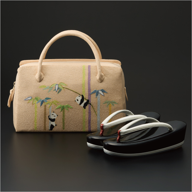 絹ちりめん地に手刺しゅうと手描きでパンダを施したバッグ。染繍の老舗〈大羊居〉の独創的なデザインと〈伊と忠〉の「みその袋」がコラボレーションしました。草履は白と黒のエナメル革を重ねた舟型タイプで品のある装いにぴったり。台に厚みがあるので、着姿をより美しく見せます。