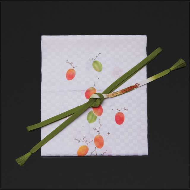 高麗ぼかしにねじったような組目が特徴の帯締めと、市松綸子地にカラスウリを手染めした風趣豊かな帯揚げ。スタイリッシュな意匠で、季節感が感じられます。