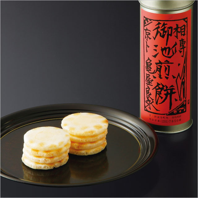 天保3年(1832年)創業。上質な餅米を贅沢に用いた「御池煎餅」は、亀甲形の焼き目が目印の麩焼煎餅。軽く香ばしい代表銘菓です。