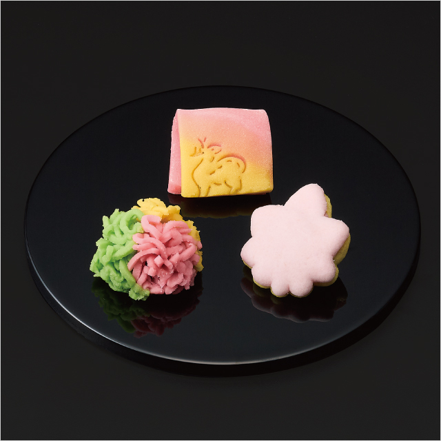 京都の御菓子司。和歌の情景を映した「鹿の声」。秋の情景を表した「深山の錦」。楓の葉の形をした「龍田姫」を詰め合わせました。