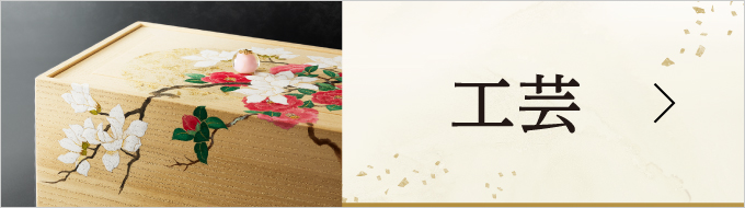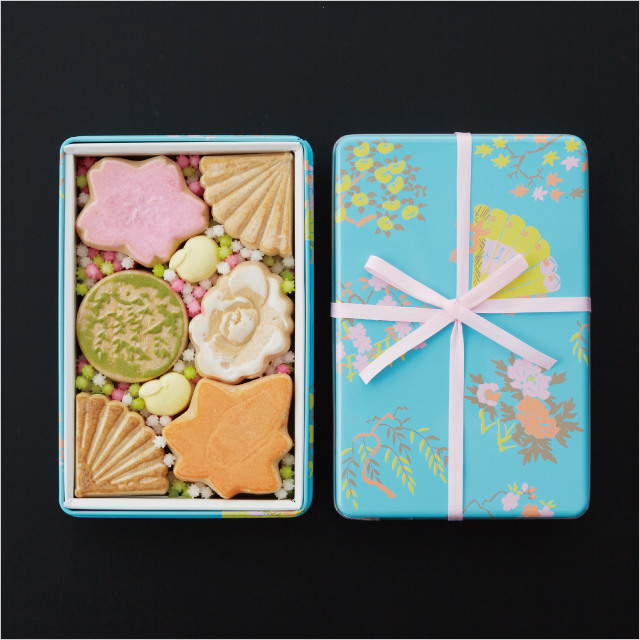 〈末富〉が池田遙邨画伯に包装紙のデザインを依頼。末富の檜扇、右近の橘、左近の桜、都の情景を映し出す牡丹と柳と紅葉をふやき煎餅と打物にて包装紙の絵柄の缶に閉じ込めました。モチーフごとに違う味をお楽しみいただける逸品です。