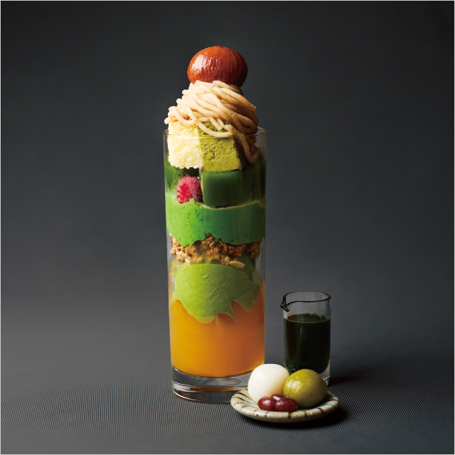京都宇治産抹茶を使用した抹茶チーズケーキ、抹茶プリン、抹茶アイスや丹波栗モンブラン、栗アイスなどをトッピングしたパフェです。お好みで抹茶蜜をかけてお召しあがりください。