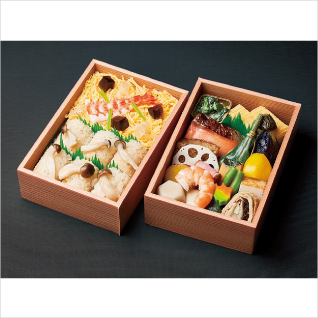 上段には彩り豊かな取り肴、下段にはちらし寿司としめじご飯を盛り込んだ、豪華な秋の京二段弁当です。