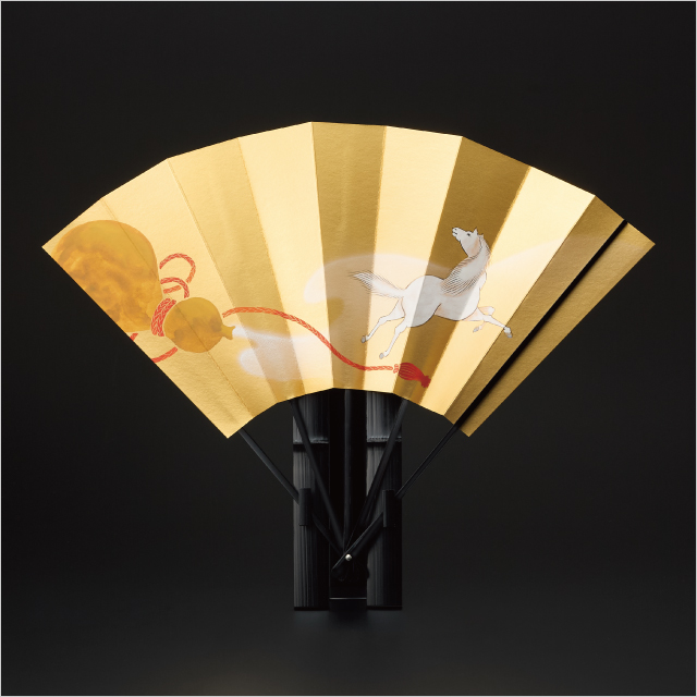 ことわざにちなんだ、ユーモアと吉兆を感じさせる新春の飾り扇子。来年の干支である午が瓢箪から飛び出し生き生きと駆ける様子が、職人の手によって一筆一筆丁寧に描かれています。