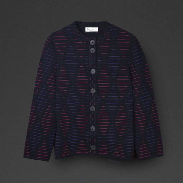 インターシャという編み方で仕上げた、イタリア製のカーディガン。立体感のある幾何学模様が特徴です。