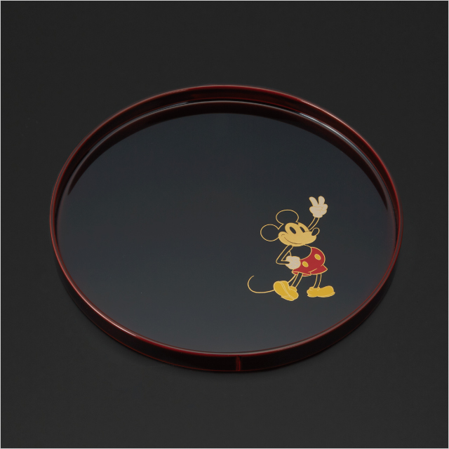 京文化で洗練された美意識を今に伝える〈漆器のアソベ〉。ディズニーオフィシャルの丸盆に、手描き蒔絵が施されています。