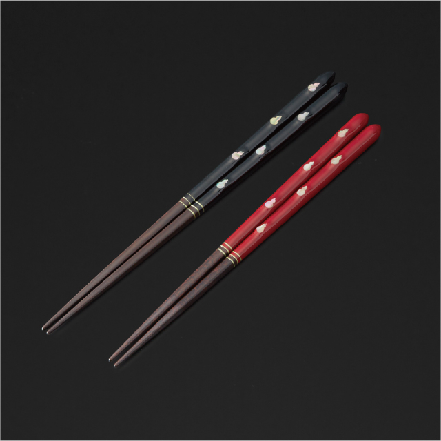 瓢箪は古来より縁起のよい物とされ、防災招福のお守りや魔除けとして広く用いられてきました。六つ揃った“六瓢箪”は無病息災のお守りになるとされています。あわび貝を瓢箪の形にして、螺鈿細工できれいなお箸にしました。
