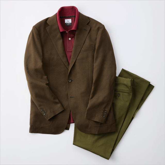 機能性と上質な光沢感を兼ね備えた“万能ジャケット”に、通気性がよくさらっとした肌触りのポロシャツをイン。ほどよいストレッチ性で快適なチノストレッチノータックパンツを合わせて。