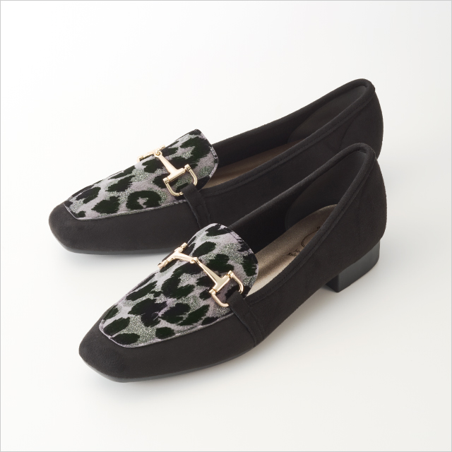 甲にレオパード柄の模様をあしらったビットローファー。ローヒールで歩きやすく、履くだけで季節感を演出できる一足です。