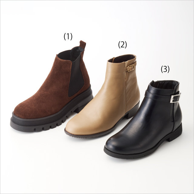 革のような風合いでキレイ見えする一足。こちらもファスナー付きで着脱しやすいことが特徴です。