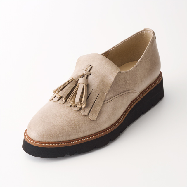底全体がヒール仕様で安定感あり。かわいいフリンジが付き、飽きのこないデザインでオールシーズン使えます。
