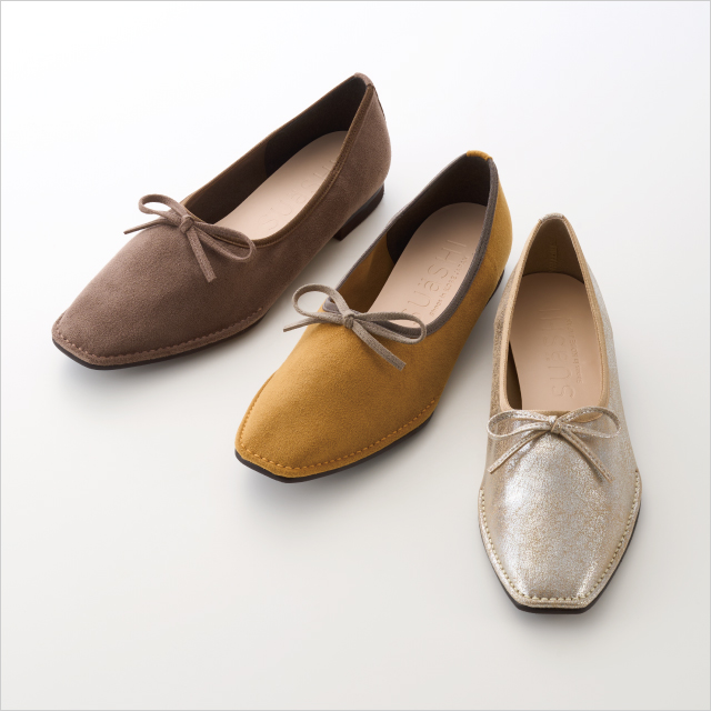 やわらかいストレッチ性のあるスエード素材で、足をやさしく包んでくれる“まるで履いていない”感覚になれる軽量パンプス。当店先行販売のマスタードカラーなどをご用意しました。