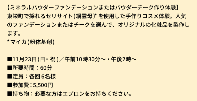化粧品原料「セリサイト(絹雲母)」を採掘する愛知県東栄町で誕生した、国産ミネラルコスメブランド。人気のファンデーションとパウダー、化粧下地クリーム、パフをオリジナル巾着袋に入れた、当店限定のセットです。