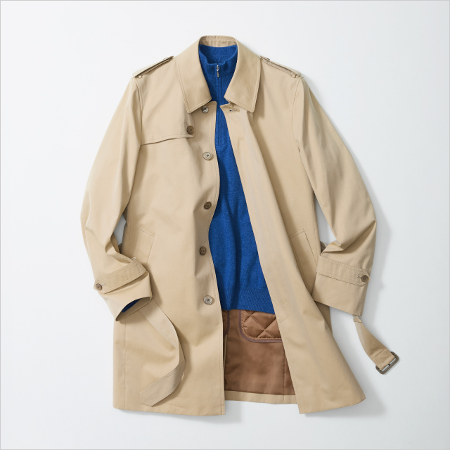 ナチュラルな風合いを生かした軽やかなライナー付きの日本製コート。インナーのカシミヤセーターは高品質で心地よい肌触りが際立つアイテムです。