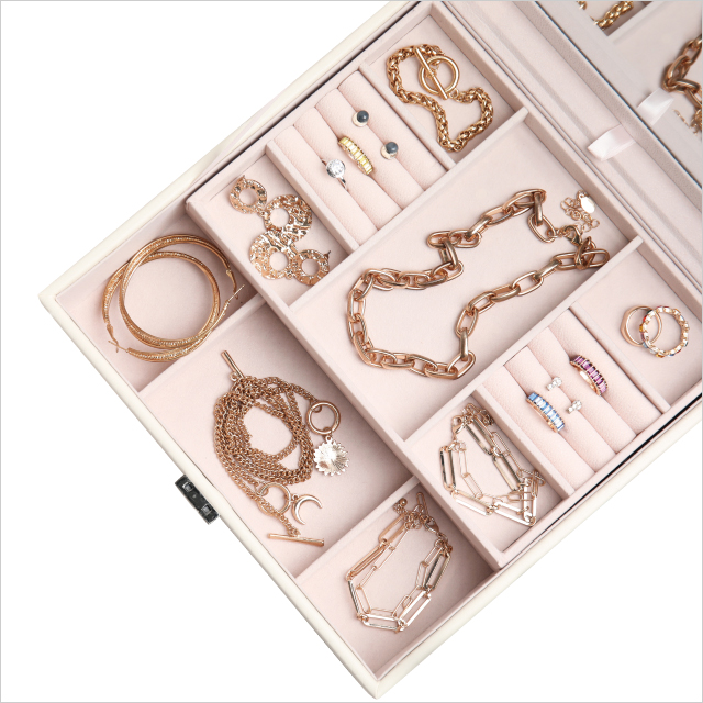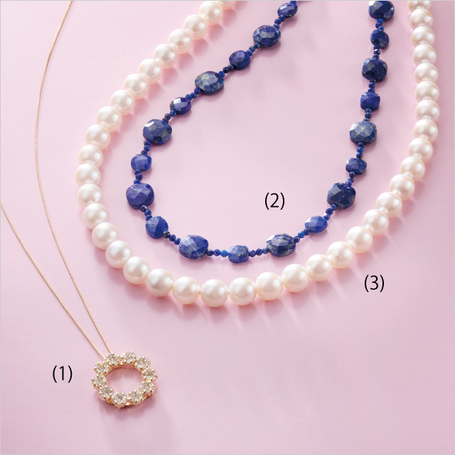 定番でフォーマルなパールネックレスと、ラピスラズリの瑠璃色が鮮やかなネックレスをご用意。ダイヤモンドを使ったサークルデザインも肌なじみのよい色合いです。