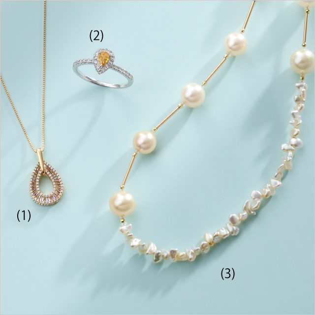 地金やイエローダイヤモンド、大小様々な真珠などが際立つアクセサリーを集めました。