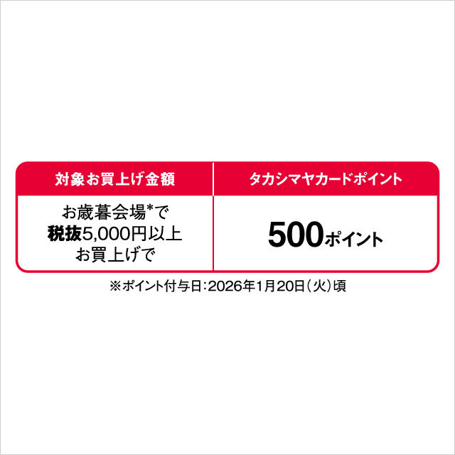 期間中、マイページにてキャンペーンにエントリーのうえ、お歳暮会場*にてマイページにご登録のカードで税抜5,000円以上ご注文いただいた方に、タカシマヤカードポイントをもれなく500ポイントさしあげます。