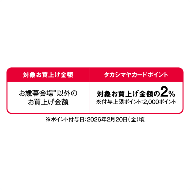 さらに、期間中マイページにご登録のカードでジェイアール名古屋タカシマヤ(ウオッチメゾン、フードメゾン 岡崎店含む)にて、お歳暮会場*以外でお買上げいただくと、通常のお買上げポイントに加えてプラス2%のタカシマヤカードポイントをさしあげます。