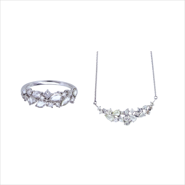 2種のダイヤモンドの輝きが合わさった魅力的なネックレスとリング。ラウンドブリリアントとローズカットがランダムに配置されたデザインです。