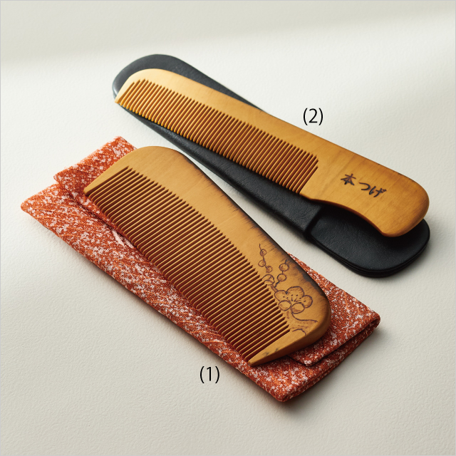 古来より愛用されている伝統的なつげ櫛は、静電気の発生が少なく、とかすほどに髪に艶と潤いを与えます。焼きゴテで梅の花を施した婦人用と、紳士用をご用意しました。
