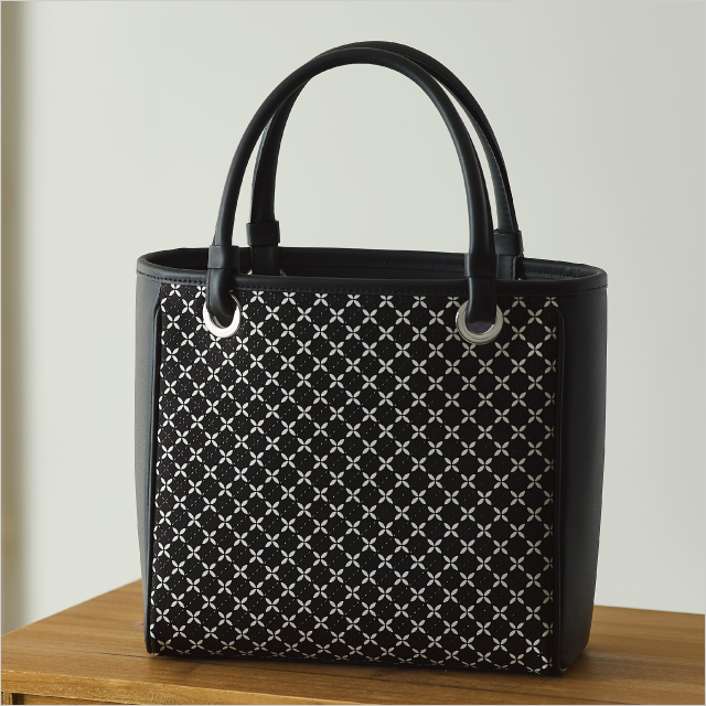 古来から伝わる独自の技法を守り続ける〈印傳屋〉。そよ風をイメージして誕生した「そよか」シリーズのバッグは、白更紗と細かい黒漆で描かれた美しい七宝繋ぎ模様が印象的。軽量で持ちやすいことも特徴です。