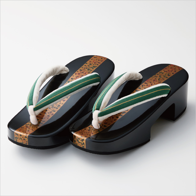 従来の津軽塗のパターンとは異なり、黒の無地に金色ベースの塗をラインで入れることで高級感を演出した下駄。底は高めで、若い世代にも人気の鼻緒(真田紐)を組み合わせました。