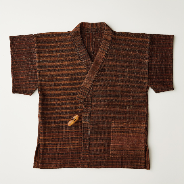 経糸と緯糸のすべてに柿渋染めした糸を使用し、丈夫で強く奥深い風合いを感じる生地が特徴。前身はシンプルで、後身に酒袋を織り込んだ布地をパッチワークしました。