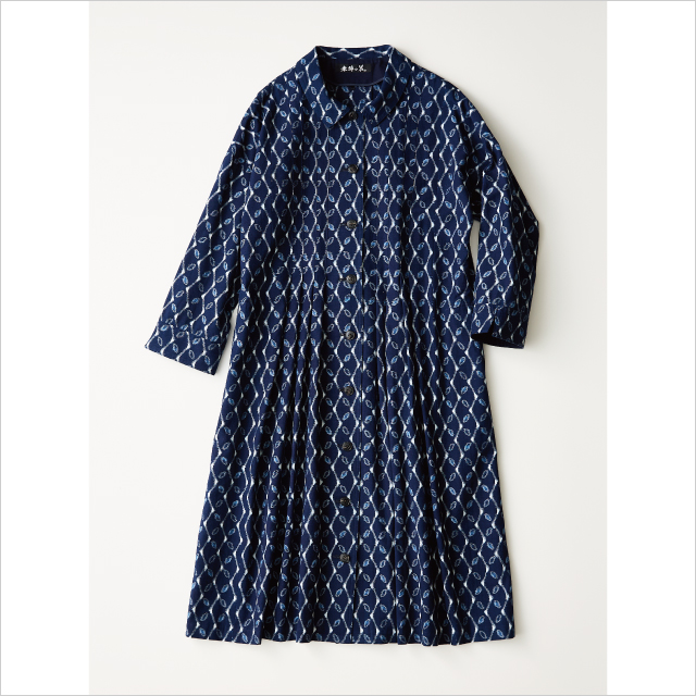 藍染で先染めされた糸を手織りで織り上げた“久留米絣”を贅沢に使用。緻密な“タテヨコ絣”の美しい流月柄が目を引くワンピースです。ボタンを開けて着用すると、軽やかな一重仕立てのコートとして着用できます。