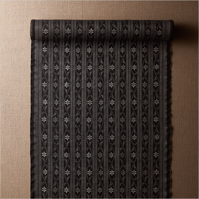 奄美大島で生まれる良質な大島紬。泥染めならではのしっとりとした、深みのある光沢が特徴。十字絣はごく限られた手織り職人によって生み出される、次代に継承したい技が詰まった逸品です。