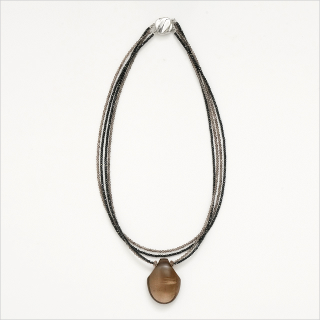 スモーキークォーツの中にルチル(針状の結晶)が入っているトップは落ち着きのある輝き。スモーキークォーツとスピネルを使い、4連にしてモダンな雰囲気に仕上げました。