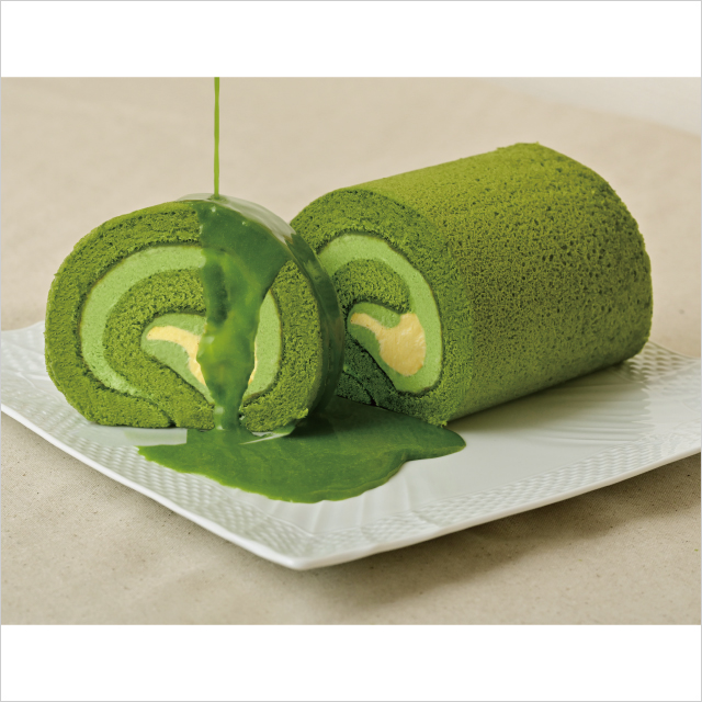 京都府産石臼挽きの一番茶のみを使用した抹茶のロールケーキに、コク深いカスタードクリームを中にしのばせ、さらに風味豊かに。特製抹茶あんソースをたっぷりかけてお召しあがりください。