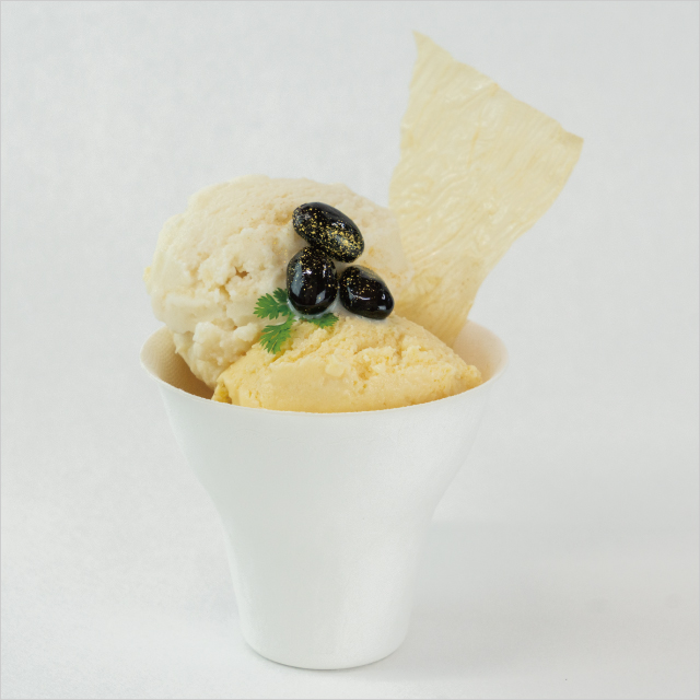京ゆばづくりに使用する豆乳“ゆば汁”と、〈湯葉弥〉の看板商品“くみあげ湯葉”を贅沢に使用した“ゆばソルベ”と“ゆばアイス”を盛り付けました。周りには、サクッと軽やかな食感の“湯葉チュイル”と、やさしい味わいの“黒豆”に金粉を添えた特製スウィーツです。