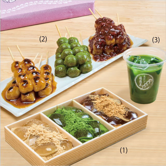 わらび餅は、本わらび粉を使用した、なめらかでやさしい口溶けが魅力。国産大豆の皮むききな粉、宇治抹茶、沖縄県波照間島産の黒糖、3種それぞれの深い味わいをお楽しみください。京だんごは、香ばしく焼き上げた秘伝のタレのみたらしと抹茶だんご、ぜんざいだんごを詰め合わせました。お店で人気の甘味抹茶「京抹茶 洛水」も登場します。
